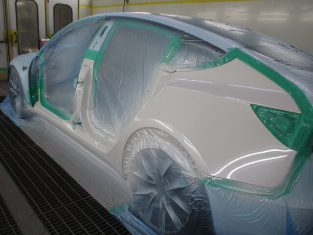 テスラ モデル3を塗装ブースに移動し、塗装部分を目の細かいサンドペーパーで研ぎ上げ表面処理を行い、様々な方法を駆使してマスキングを施し、塗装の準備が完了です。