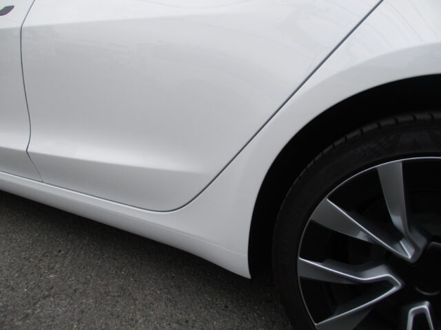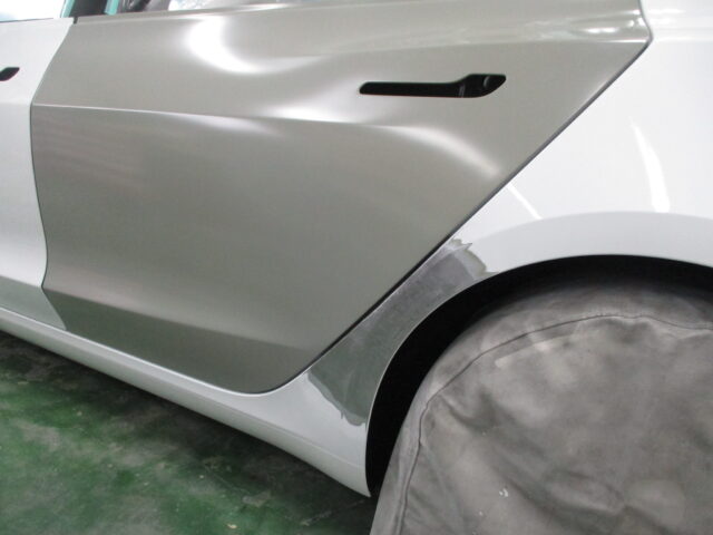 今回のテスラ モデル3の修理方針は、アルミ製のリアドアは取替塗装、クォーターパネルとロックピラーは鈑金塗装、リアドアに隣接するフロントドアへの色合わせの為のボカシ塗装と言う作業内容になります。
