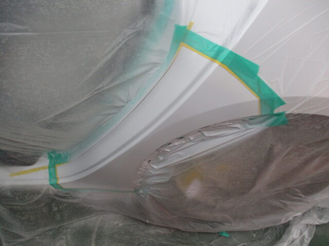 今回は自費での修理の為、脱着費用や部品代を抑える為、リアバンパーやクォーターガラスは取り外さずにマスキング処理にて作業を行いました。
