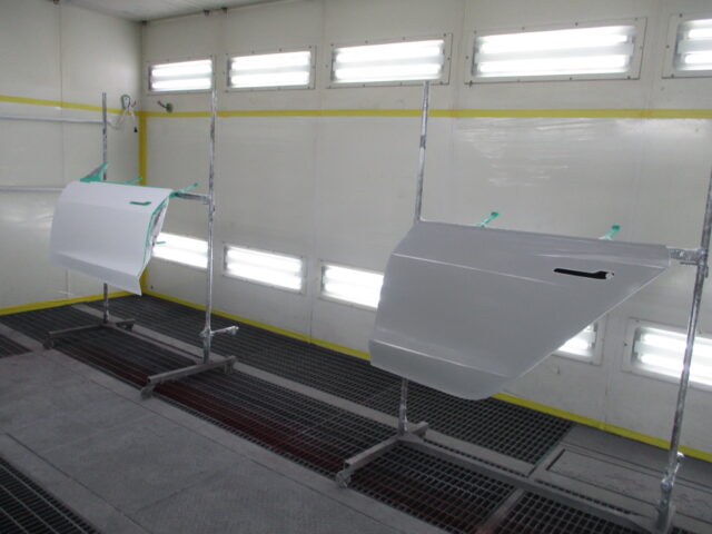 新品のリアドアパネルと色合わせの為のボカシ塗装を行うフロントドアを、塗装のし易い高さに固定できる専用の塗装台にセットして、前後ドアパネルの塗装準備も完了です。