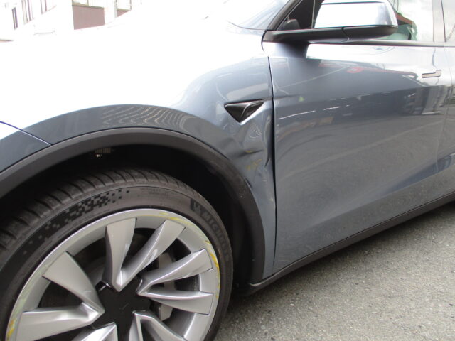 塗装作業完了後、取り外していた部品を全て元通りに組み付け、ヘッドライトの点灯確認やサイドリピーターカメラのキャリブレーションを行い、洗車・最終仕上げ磨きをしてテスラモデルYのフロントフェンダー取替塗装修理は完了です。
