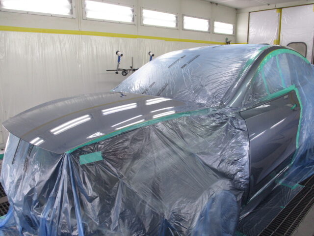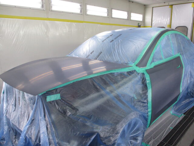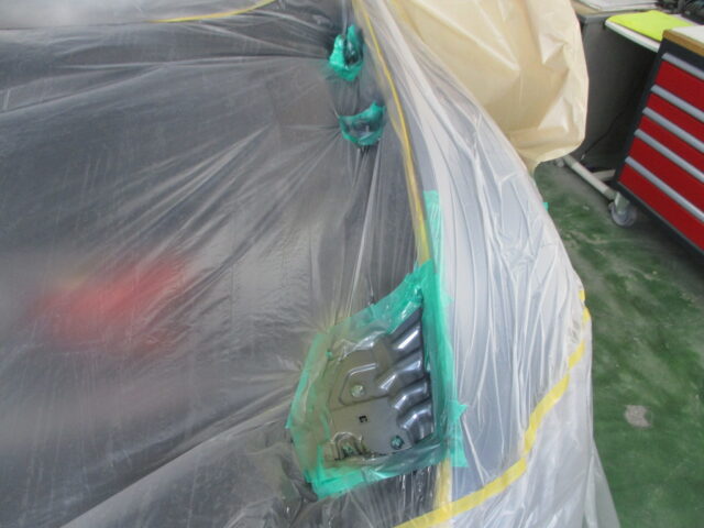 フロントフェンダーに隣接するボンネットやフロントドア、傷を削り落したフロントピラーの各パネル全面を目の細かいサンドペーパーで研ぎ上げ表面処理を行い、様々な方法を駆使してマスキングを施し、僅かな色の差異も出来ない様に色合わせの為のボカシ塗装を行います。