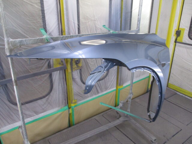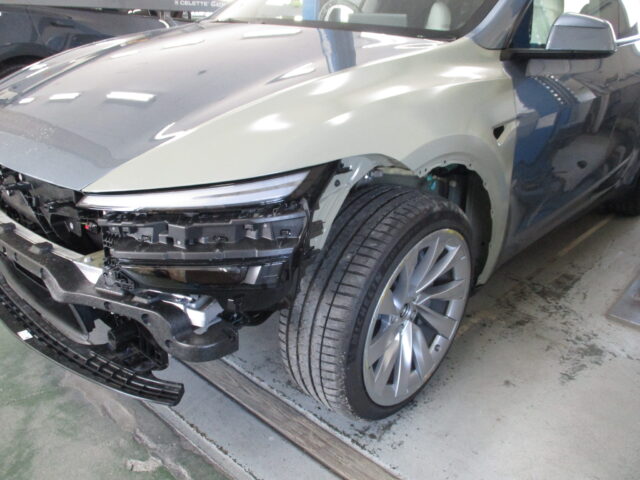 今回のテスラモデルYの修理方針は、左フロントフェンダーの取替塗装、フロントピラーの傷の修理塗装、フェンダーに隣接するボンネットやフロントドアへの色合わせの為のボカシ塗装と言う作業内容になります。