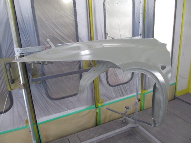 新品のフロントフェンダーを、塗装のし易い高さに固定できる塗装台にセットしてフロントフェンダーの塗装準備が完了です。