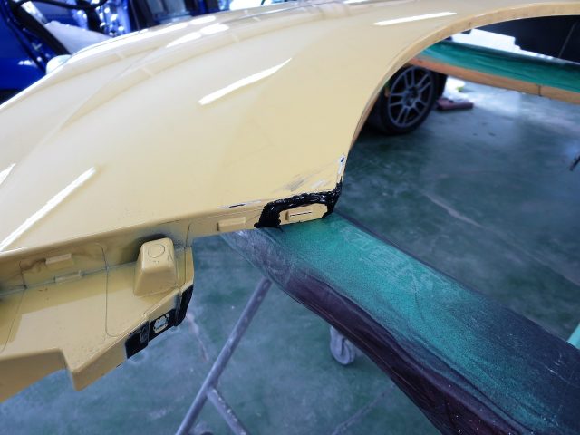 加熱修正でパネルの変形はほぼ復元できそうで、フロントバンパー・フロントフェンダー共に角の折り返し部分が割れておりましたが、樹脂用の強力な接着剤を使い修理可能と判断しました。