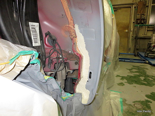 右リアドアとクォーターパネルは大きく凹み、ドアは裏側パネルも変形しておりました。