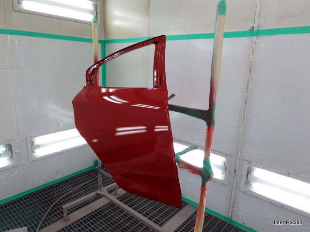 裏吹きが終わったリアドアパネルを車体に取付け、クォーターパネルと色合せの為に塗装するフロントドアも含めた3パネルを目の細かいサンドペーパーで研ぎ上げ、塗装ブース内で丁寧にマスキングを施し、入念に脱脂します。