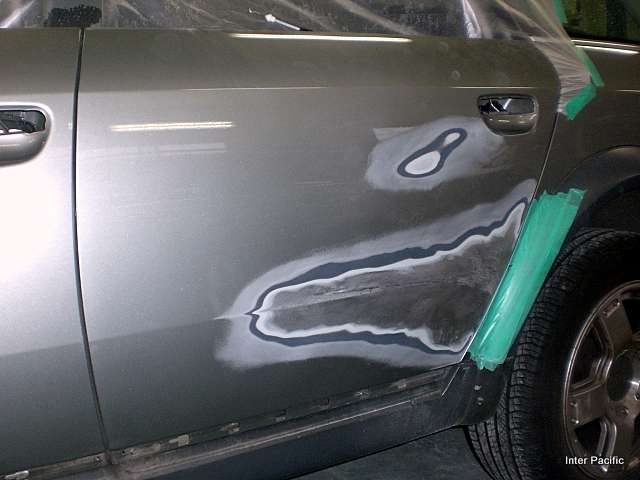 リアドアのへこみを丁寧に板金します。出来るだけ元通りの面になるように仕上げます。