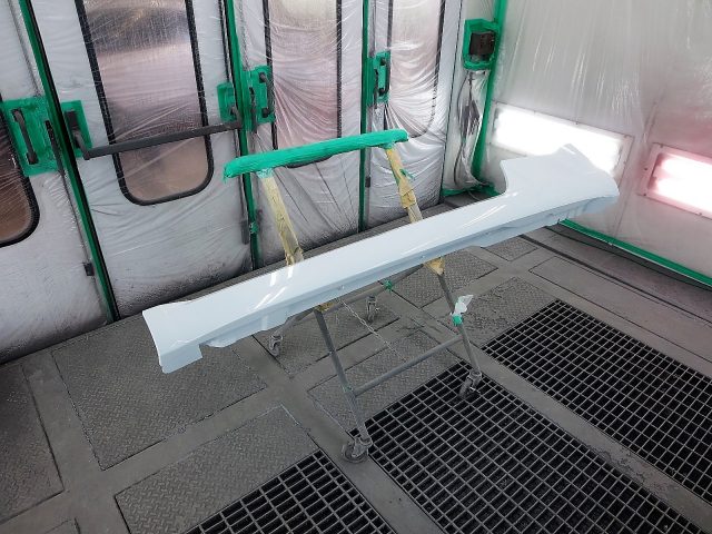 パテを付けた部分を覆い隠す様にプライマーサフェーサーを塗装し、しっかりシールして赤外線ヒーターで十分に加熱乾燥させます。