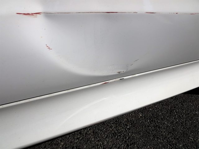 BMW X5の左フロントドアは広範囲にへこんでしまい、ステップカバーも変形してしまいました。