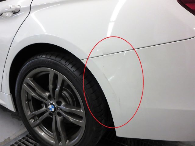 今回のBMW 420iグランクーペの損傷は、左フロントドアの後端部に擦り傷がありリアドアとクォーターパネルのへこみ、サイドステップカバー後端部とリアバンパーの左角の傷となります。