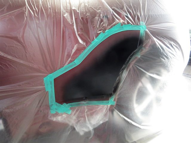 リアドアと色合わせの為のボカシ塗装をするクォーターパネルの表面を目の細かい研磨紙で研ぎ上げた後、様々な技術を駆使してマスキングを施します。