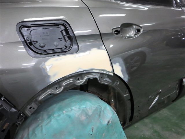 板金修理部分に僅かに残る凹凸にはパテを付けて綺麗に成形します。