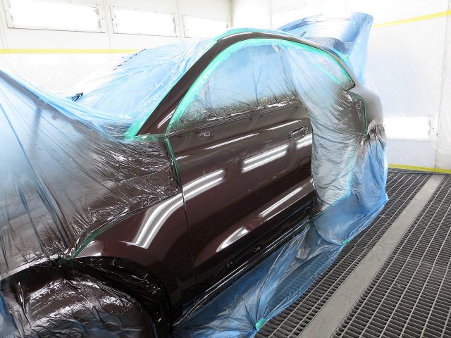 ポルシェ マカンSをゴミや埃をシャットアウトした塗装ブースに移動し、塗装の痕が残らないように様々な技術を駆使してマスキングを施し、熟練の塗装職人がポルシェ マカンSの塗装肌や質感を再現すべく丁寧に塗装します。