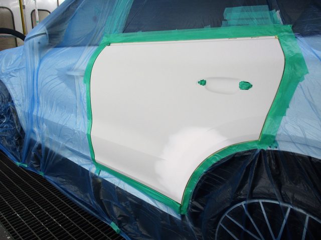 リアドアの付属部品を取り外し、目の細かい研磨紙でリアドアパネルの表面を研ぎ上げ、様々な技術を駆使してマスキングを施し塗装の準備は完了です。