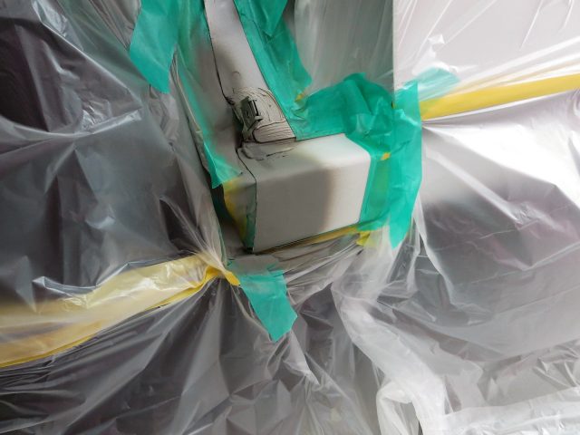 板金修理部分を覆い隠す様にプライマーサフェーサーを塗装し、しっかりシールして赤外線ヒーターで十分に加熱乾燥させます。