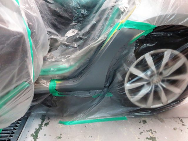 今回は自費修理の為リアドアはプレスラインを利用して塗装を切り、クォーターパネルはリアピラー上部のルーフサイドパネルの細くなっている部分まで塗装する方法を採りました。